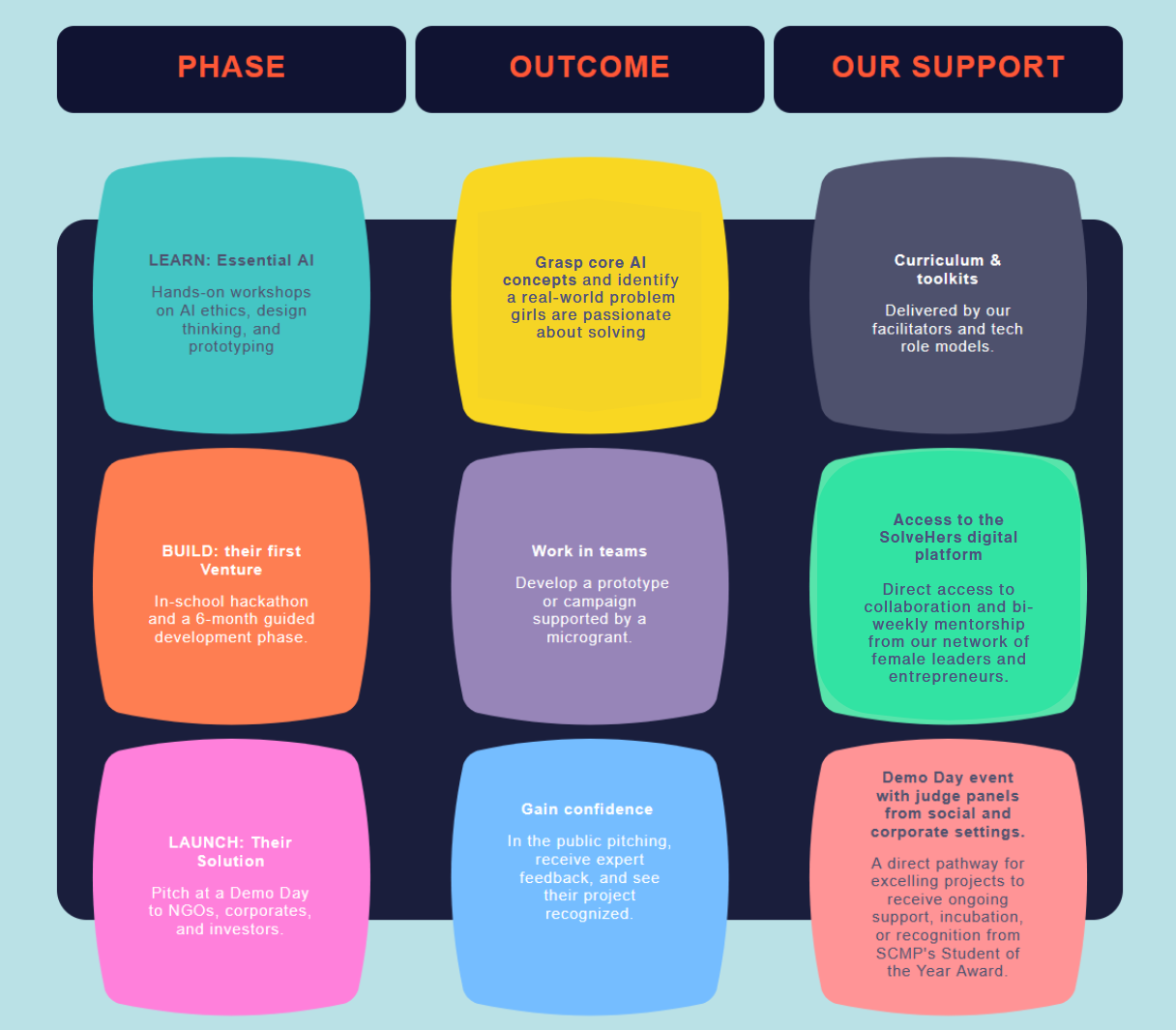 SolveHers is more than a workshop; it's an integrated venture-building platform where girls aged 14-18 identify community challenges and build AI-powered solutions, transforming from students into confident tech leaders and entrepreneurs.